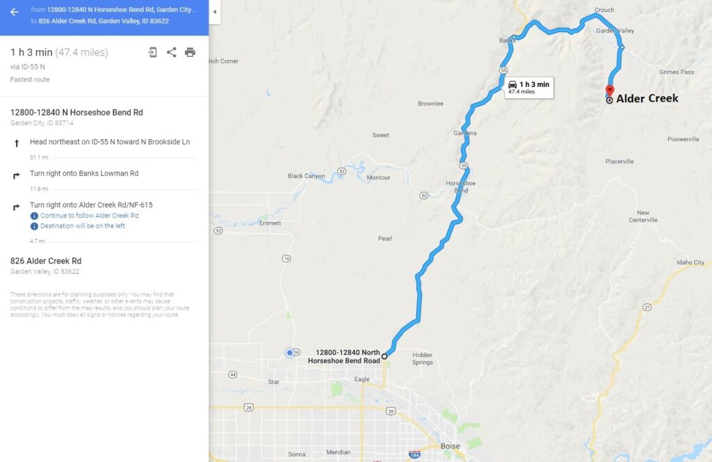 Driving Directions from Boise: Take HWY 55 (from State Street aka HWY 44), north out of Boise towards McCall. You will stay on HWY 55 for approximately 42 miles, and make a right onto HWY 17 at Banks (heading towards Garden Valley/Lowman). Continue on HWY 17 for approximately 11.5 miles (about a mile past Garden Valley), turning right (south) on the Meadow Creek Rd. (NF 615 aka Alder Creek Rd. that heads to Placerville). In a ¼ mile you will cross the bridge over the SF Payette River. Stay on this for 4.7 miles until you reach the mining claims. The claims are marked on the side boundaries (north/south or east/west edges) along the road (on the creek side), as well as corner markers.