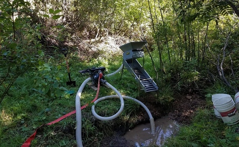 As you can see from setting up with a high-banker in late summer, you will want to have a hole established in spring for adequate water to run for the year. On Golden Stag there is a larger pond to pull water for high-banking in case the creek drops. Due to experience (working various areas of Deer Cr for 30+ years and KNOWING its rich history), with these gold pics, I only ran the high-banker for about an hour to come up with these results (only getting down about 1.5’), deeper you get the quantity/yield of gold and size of pieces increases exponentially (same is true on ANY drainage with gold being one of the heaviest elements in the creek).