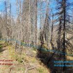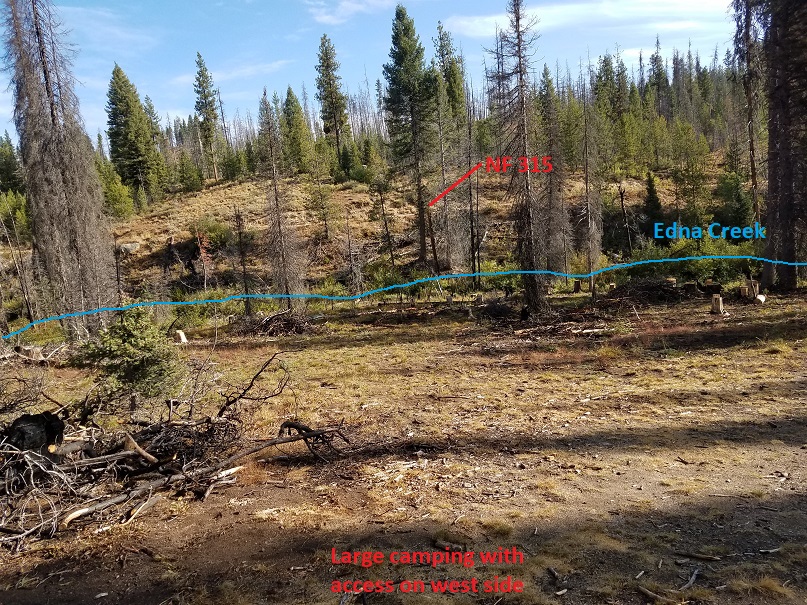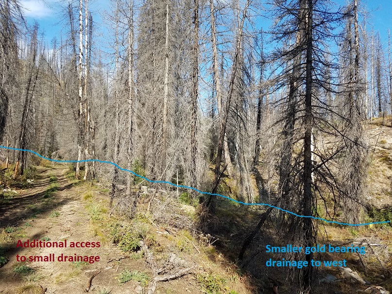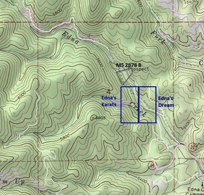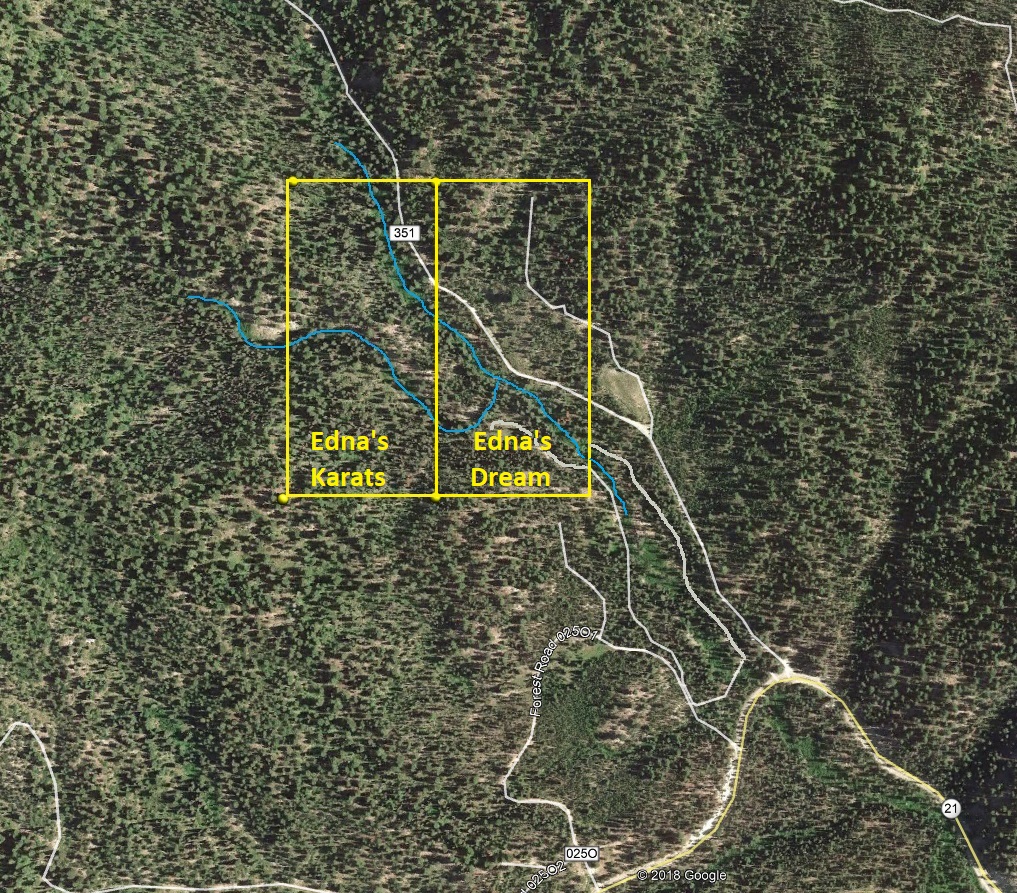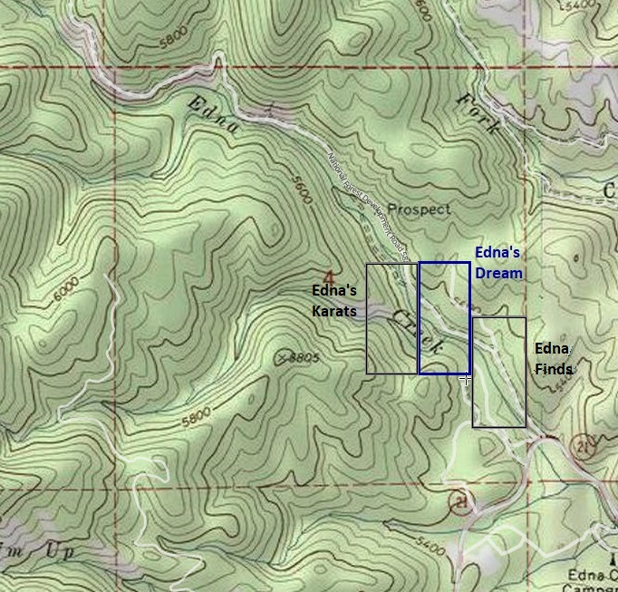 These two mining claims up on the historic Edna Creek, have really good access, along with a few different camping options “on” the mining claims. These two claims are also positioned below the historic Edna Mill and old mining town. See our notes under “Crooked River” about the glacial activity and deposits, as this can be found even on the hills over these claims.