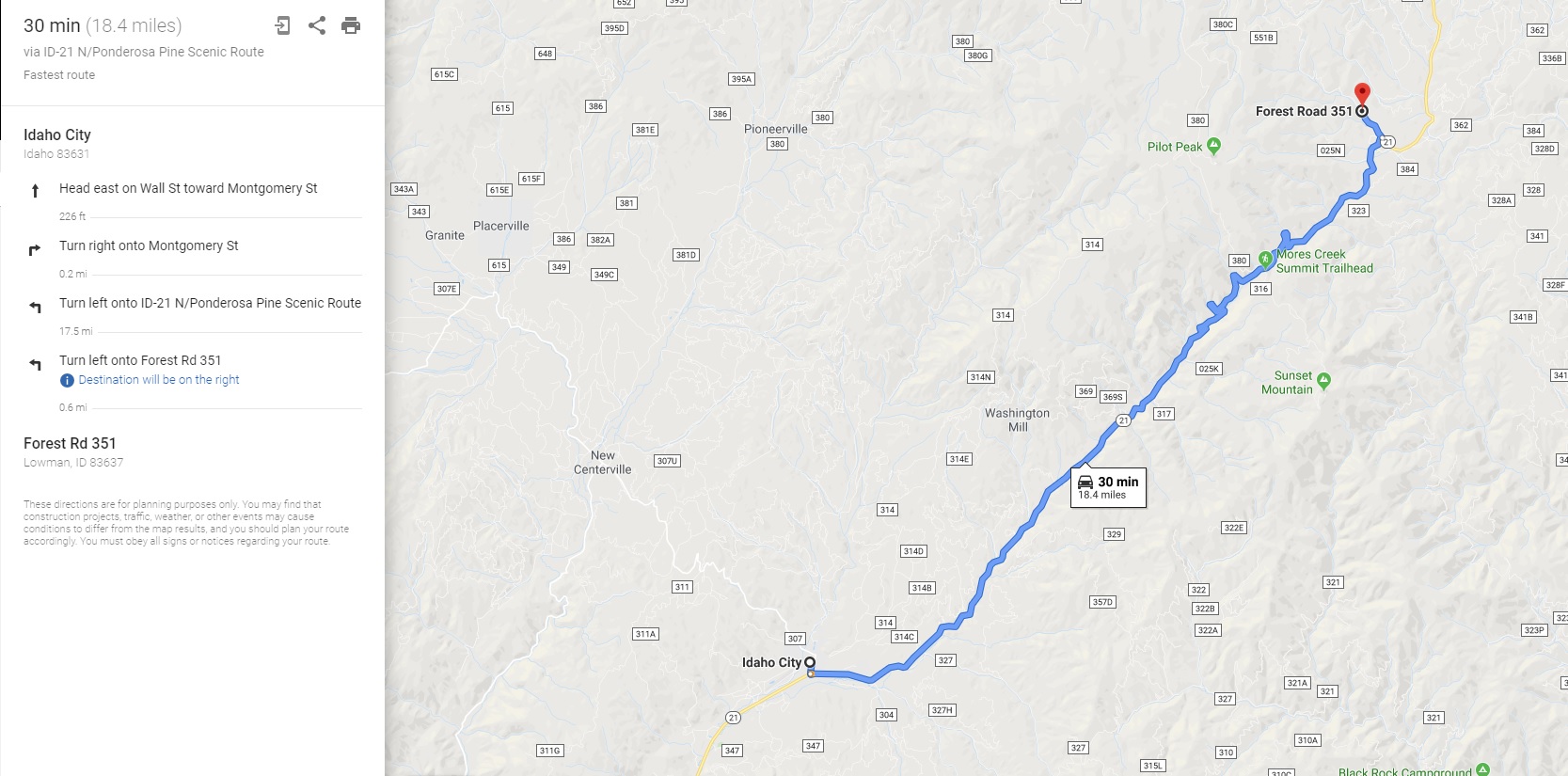 The claims are located 17.5 miles outside the historic town of Idaho City. Driving directions to the claim: from Boise, travel north on HWY 21 to Idaho City (approximately 34 miles from I-84). Continue on HWY 21 for an additional 17.5 miles past Idaho City and turn left (north) onto NF 351 road, (halfway between the Whoop Um UP pullout & Edna Creek Campground). The mining claims start approximately ¼ of a mile after turning onto NF 315. All of the mining claims have been signed along the creek side of the road to help identify where the mining claims start & end.