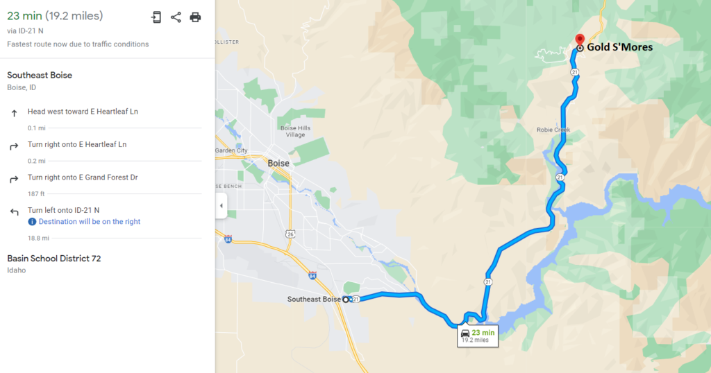 On the claim is a large pull out on either side of Highway 21 with adequate parking for start setting up your operation. The old mining town of Idaho City is only 15 miles away where provisions are available, or scattered around even closer, are several old mining ghost towns, like Pioneerville, Centerville, Placerville, Grimes Pass, Quartzburg. Check out Gold S’Mores today! Yes, Highway 21 is open year round, so while there is snow up in this area during the winter months, in late March it is mostly melted off in this elevation.