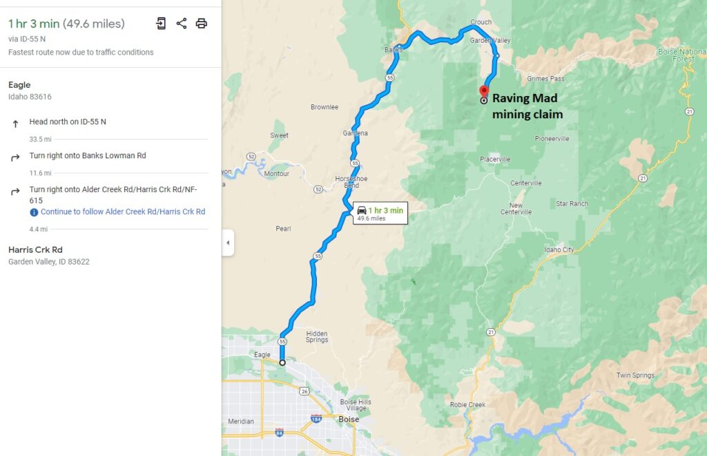 Driving Directions from Boise: Take HWY 55 (from State Street aka HWY 44), north out of Boise towards McCall. You will stay on HWY 55 for approximately 42 miles, and make a right onto HWY 17 at Banks (heading towards Garden Valley/Lowman). Continue on HWY 17 for approximately 11.5 miles (about a mile past Garden Valley), turning right (south) on the Meadow Creek Rd. (NF 615 aka Alder Creek Rd. that heads to Placerville). In a ¼ mile you will cross the bridge over the SF Payette River. Stay on this for 4.5 miles (from HWY 17), to the mining claim or when you get to the asphalt portion before the bridge (Alder Creek will be on the lefthand side the whole way up, but at this claim is where the road crosses Alder Creek) you will be “on” the mining claim, or when you get over the bridge you will be on the southeast end of the mining claim.