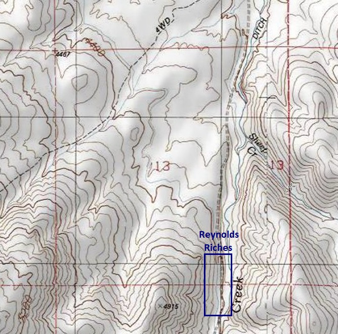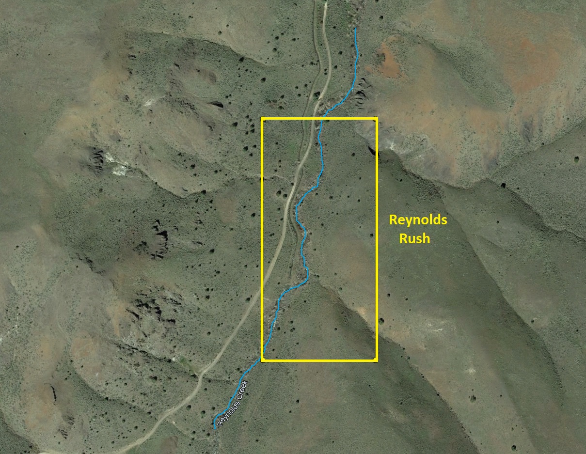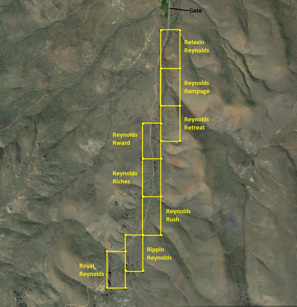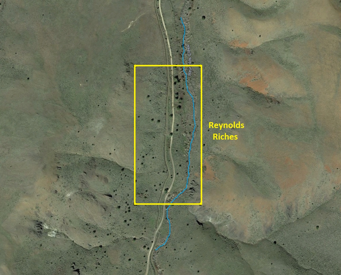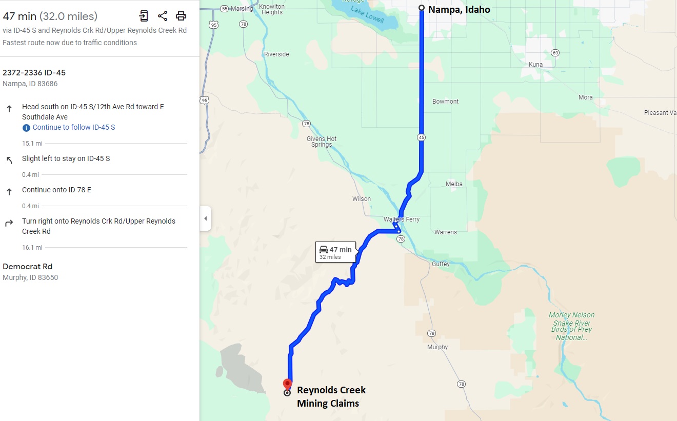 Driving Directions: From Nampa, travel south on HWY 45 approximately 14 miles to the HWY 78 junction, road will naturally curve left (southeast) onto HWY 78. In 0.4 of a mile make a right onto Reynolds Creek Road. You will stay on this for 16.0 miles until you reach a gate. The gate is not locked, but needs closed behind you. The mining claims start at approximately 800’ (0.16 of a mile) past the gate, and extend up Reynolds Creek Road for another 2 miles.