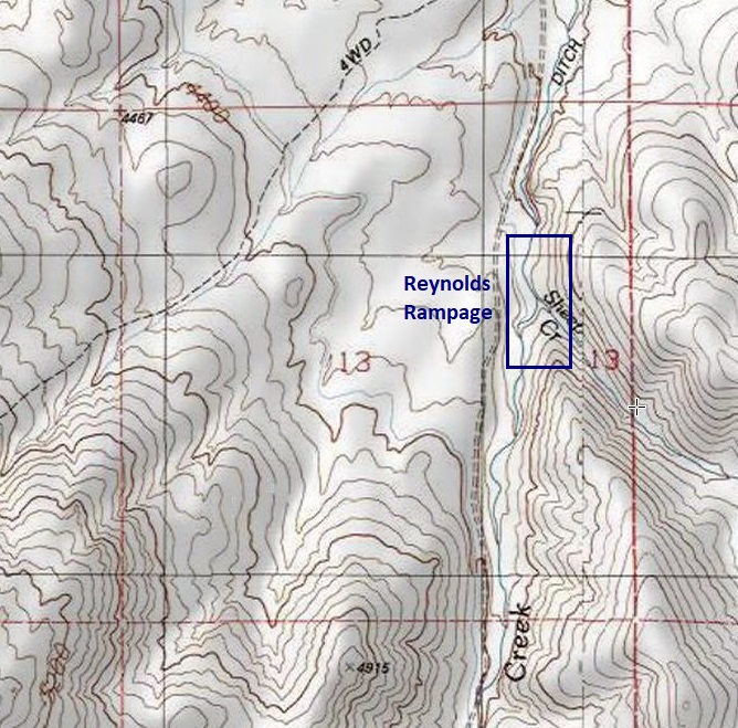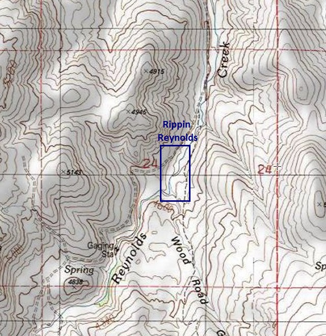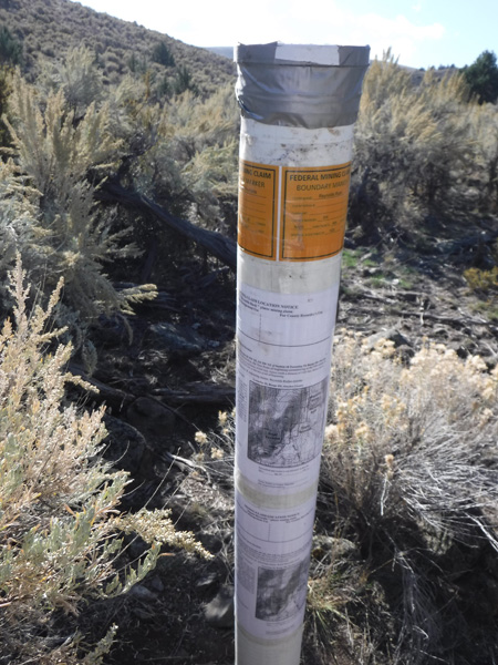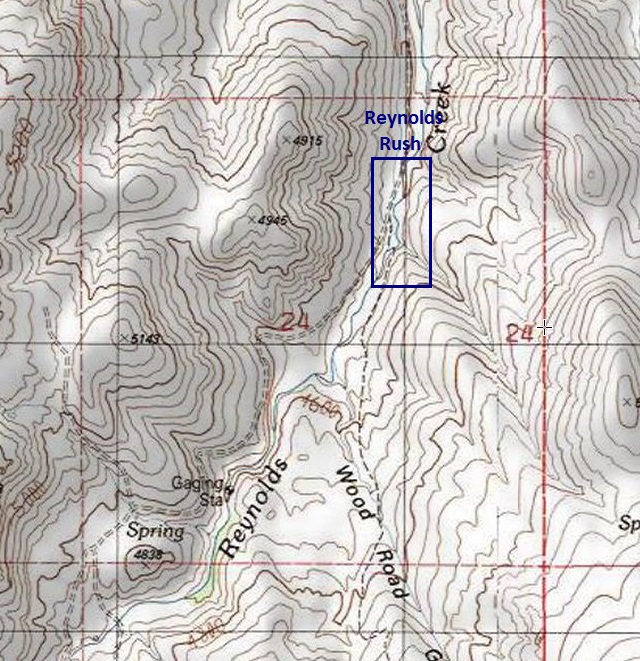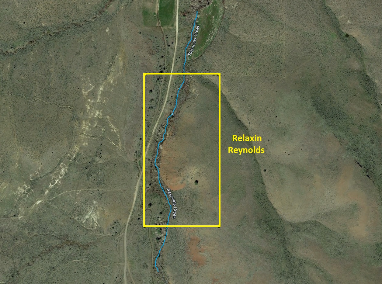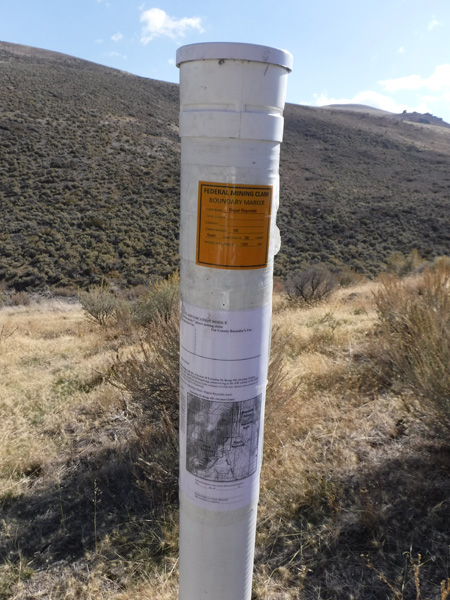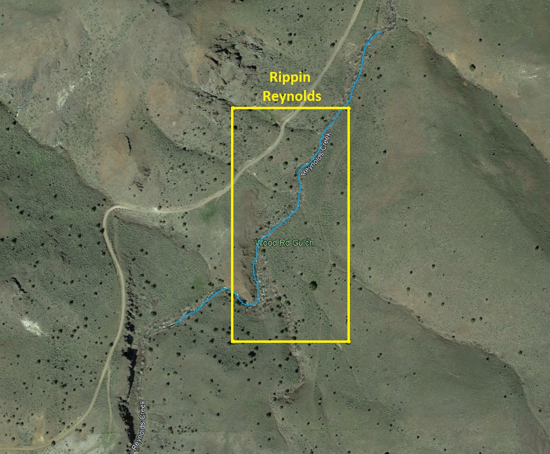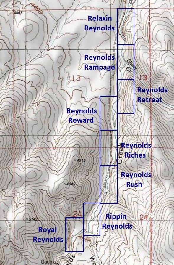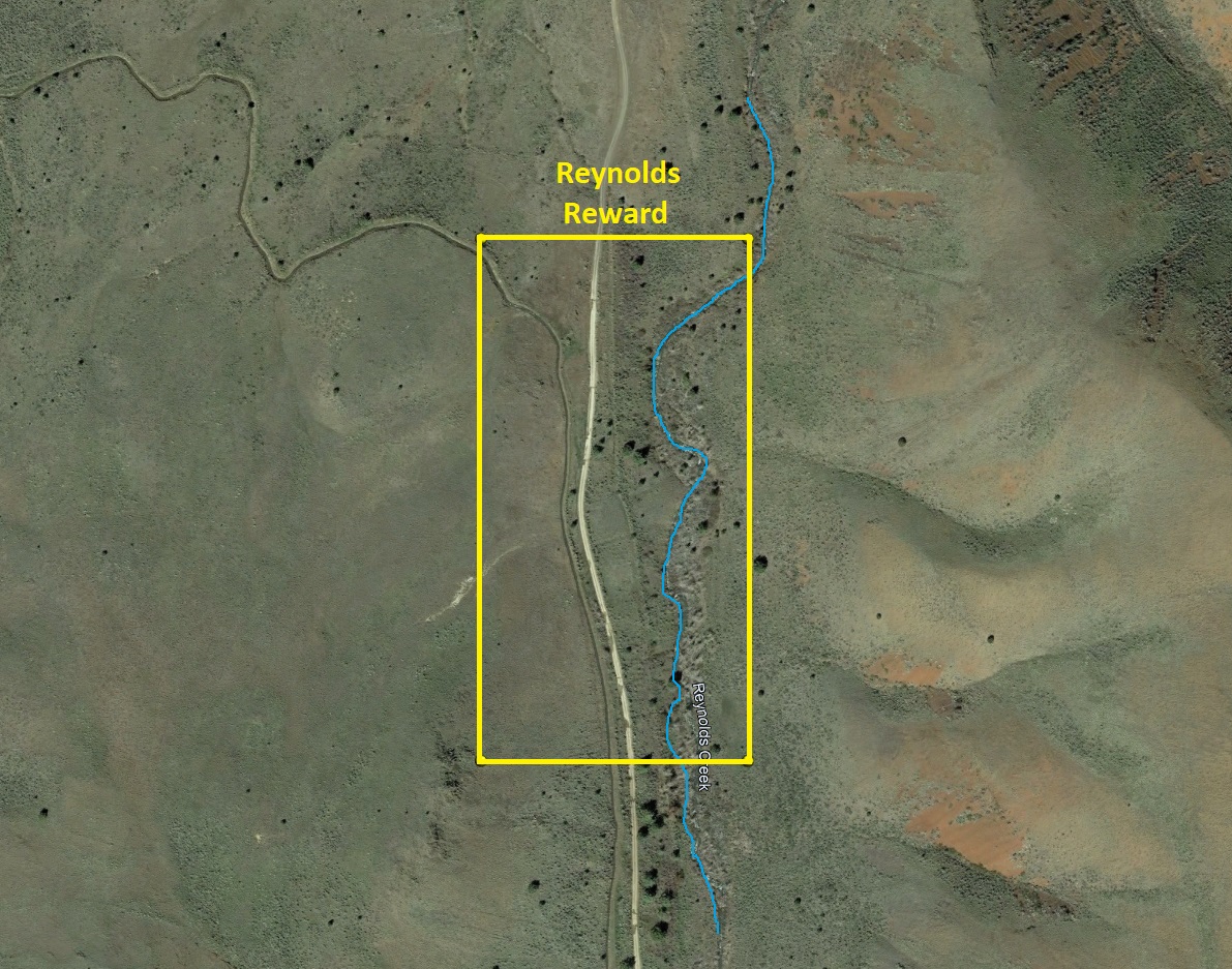 Driving Directions: From Nampa, travel south on HWY 45 approximately 14 miles to the HWY 78 junction, road will naturally curve left (southeast) onto HWY 78. In 0.4 of a mile make a right onto Reynolds Creek Road. You will stay on this for 16.0 miles until you reach a gate. The gate is not locked, but needs closed behind you. The mining claims start at approximately 800’ (0.16 of a mile) past the gate, and extend up Reynolds Creek Road for another 2 miles.