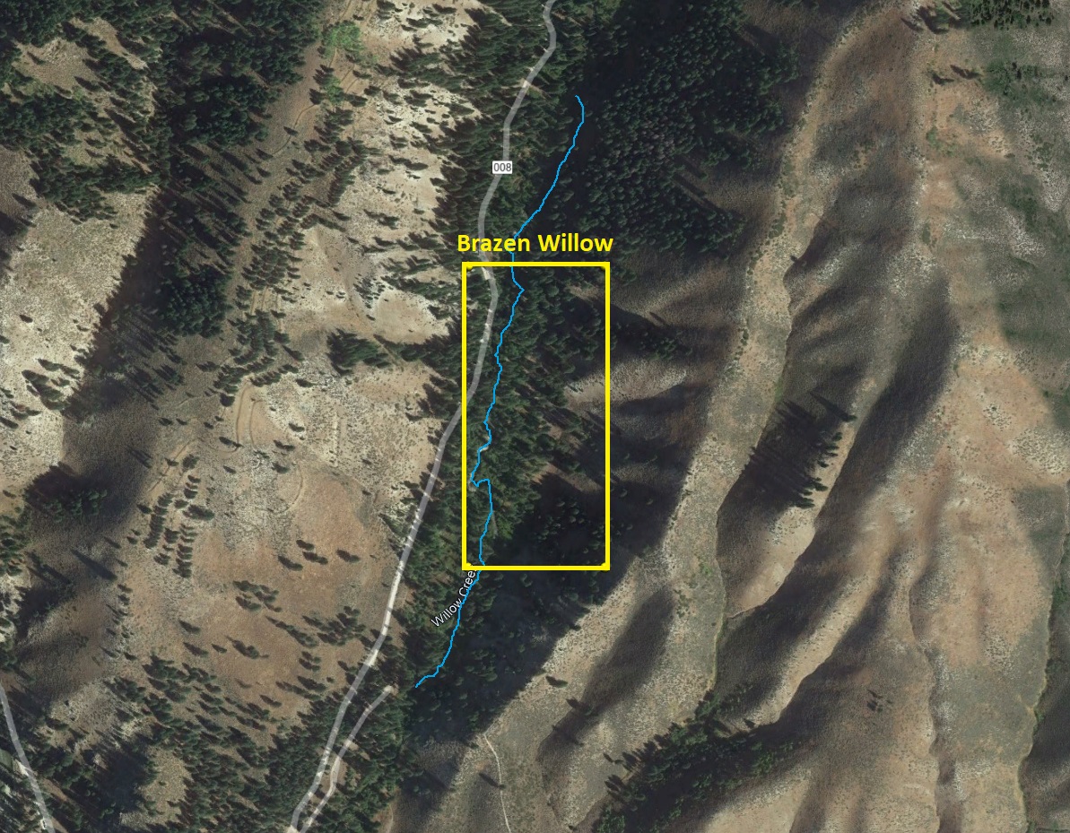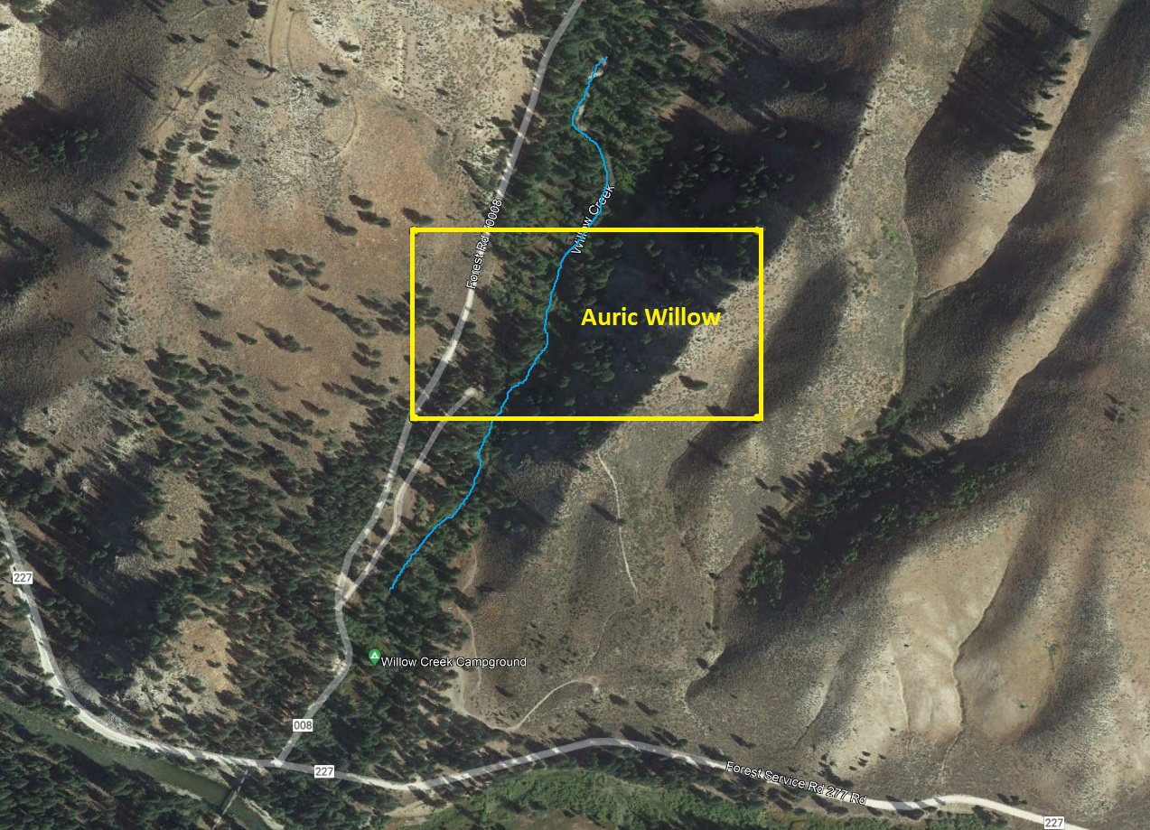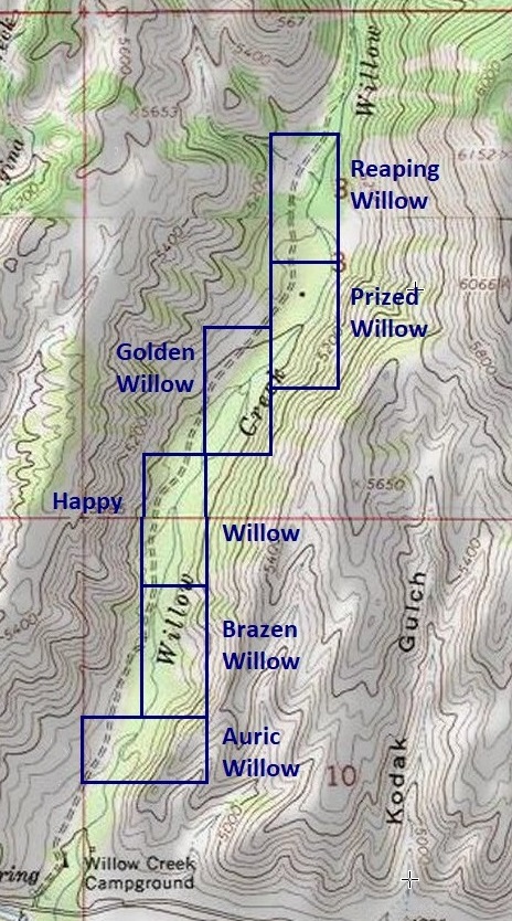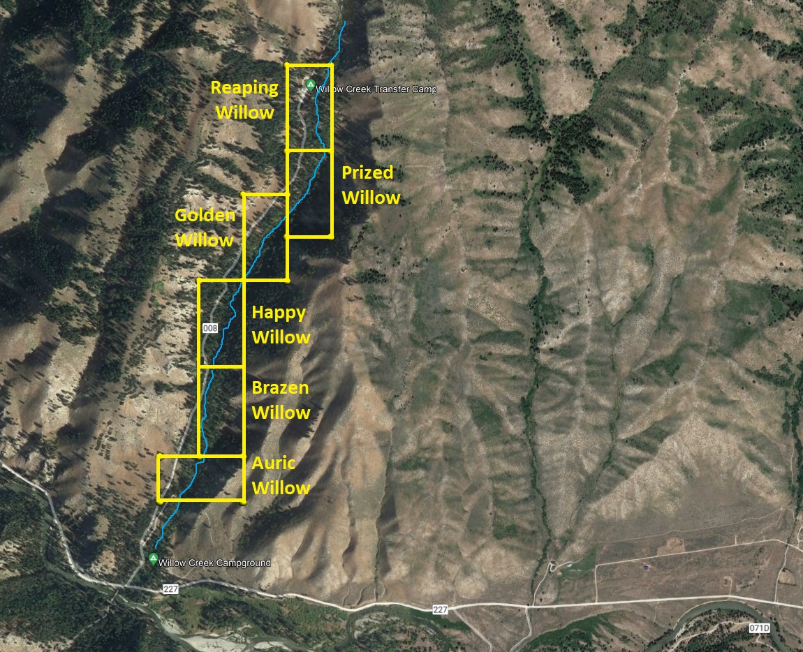 - River footage: 1400’ of Willow Creek - 4-6 camping areas on claim
